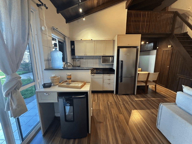 Cocina equipada con utensilios básicos para hospedaje